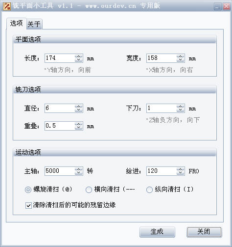銑平面小工具專門用來生成銑平一個平面的G代碼的小工具 使用:平面選項 銑刀選項 運動選項