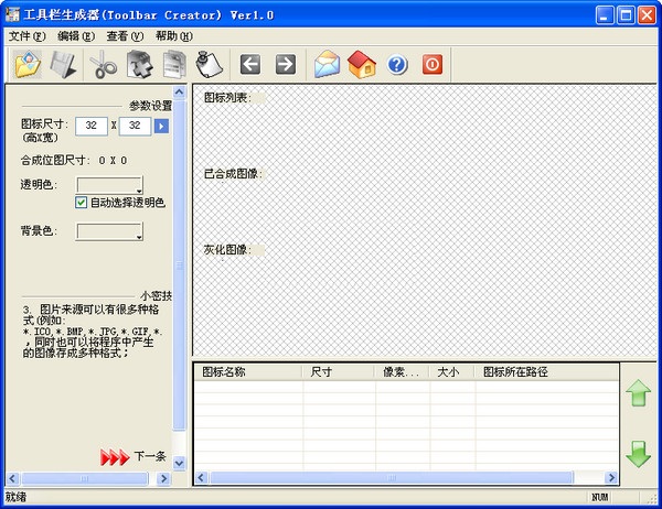 我曾經(jīng)在網(wǎng)上找到了一個叫Visual Toolbar的工具,但是發(fā)現(xiàn)要注冊才可以使用,而且有些功能不能滿中我的要求。沒有辦法,所以我決定自己做一個出來。這就有了現(xiàn)在這個程序,就叫它Toolbar Creator好了。您即可以用它制作工具欄,也可用來制作圖像列表(用于CImageList)。