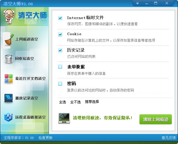對Internet臨時(shí)文件、cookie、歷史記錄、表單數(shù)據(jù)、密碼等上網(wǎng)痕跡進(jìn)行清理,有效保護(hù)上網(wǎng)隱私!
