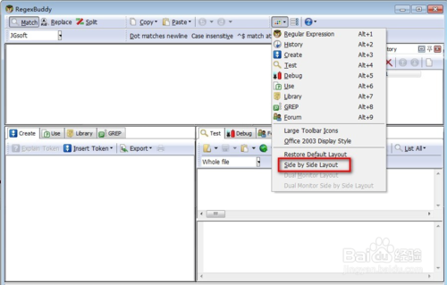 如何使用regexbuddy切換布局?點(diǎn)擊右上角的彩色格子圖標(biāo),選擇 Side by Side Layout: