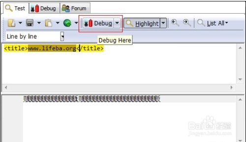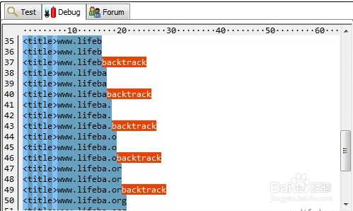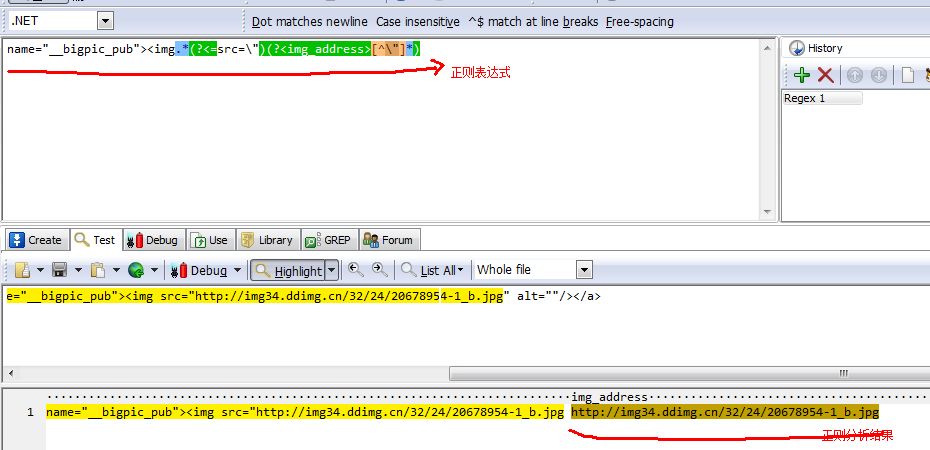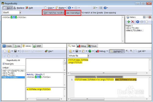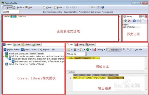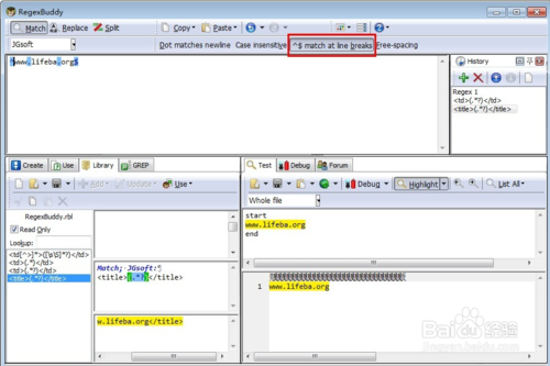 <打開(kāi)RegexBuddy后默認(rèn)載入的是上一次你所測(cè)試的正則信息,選項(xiàng)配置信息都會(huì)自動(dòng)載入上次你所設(shè)置的內(nèi)容。歷史記錄中顯示的是你所測(cè)試過(guò)得正則信息。1、測(cè)試正則表達(dá)式。、在正則表達(dá)式輸入需要測(cè)試的正則,如:??梢酝ㄟ^(guò)上面的面板選擇語(yǔ)言,默認(rèn)是JGosft,可以指定JAVA,Python等。<br b、測(cè)試文本面板(Test標(biāo)簽)輸入需要測(cè)試的文本內(nèi)容,如:??梢赃x擇Line By Line、Whole File、Page By Page,來(lái)指定是每行抽取,還是對(duì)整個(gè)文檔抓取等(如果你的正則匹配信息有包含多行內(nèi)容,務(wù)必要選中Whole File或者Page By Page)。測(cè)試文本面板會(huì)根據(jù)正則表達(dá)式和測(cè)試內(nèi)容,實(shí)時(shí)顯示匹配到的高亮預(yù)覽信息。如:上圖中的,全部高亮,如果你選中了HighLight下得HighLight Group1選項(xiàng),還會(huì)實(shí)時(shí)顯示抽取出來(lái)的內(nèi)容:www.lifeba.org。上面2個(gè)部分用不同的顏色模塊顯示區(qū)分。當(dāng)然你也可以不選擇預(yù)覽。c、輸出結(jié)果面板,顯示的顯示了正則表達(dá)式的匹配結(jié)果。你可以通過(guò)List All切換顯示的效果,如下圖所示: