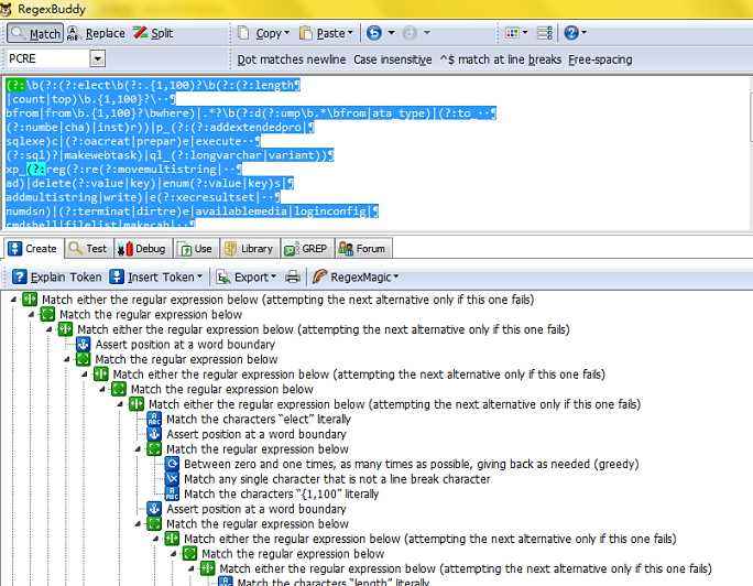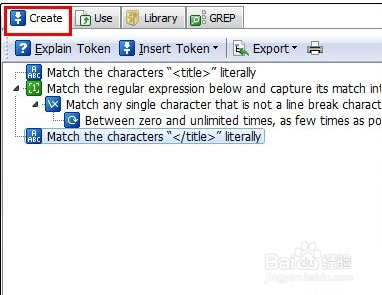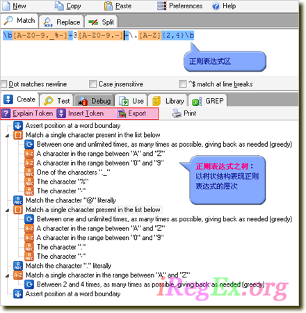 Create面板。對(duì)這個(gè)正則表達(dá)式的解釋的一個(gè)樹(shù)狀展示,其中的每一個(gè)節(jié)點(diǎn)對(duì)照著表達(dá)式中的一個(gè)元素塊,在RegexBuddy中被稱(chēng)為一個(gè)“token”,我們點(diǎn)擊其中的一個(gè)節(jié)點(diǎn),就會(huì)在我們所輸入的表達(dá)式的相應(yīng)部分進(jìn)行著重顯示。在分析他人所寫(xiě)的復(fù)雜的表達(dá)式的時(shí)候在這里查看會(huì)十分方便,如下圖所示:
