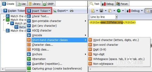 點(diǎn)擊 Insert Token按鈕會(huì)彈出一個(gè)下拉菜單,其中包含了正則表達(dá)式里涉及的所有語(yǔ)法符號(hào),可以進(jìn)行選擇,當(dāng)然對(duì)于語(yǔ)法十分熟悉后,就可以不用這個(gè)菜單,直接在上面的文本輸入?yún)^(qū)鍵入表達(dá)式了,如下圖所示:
