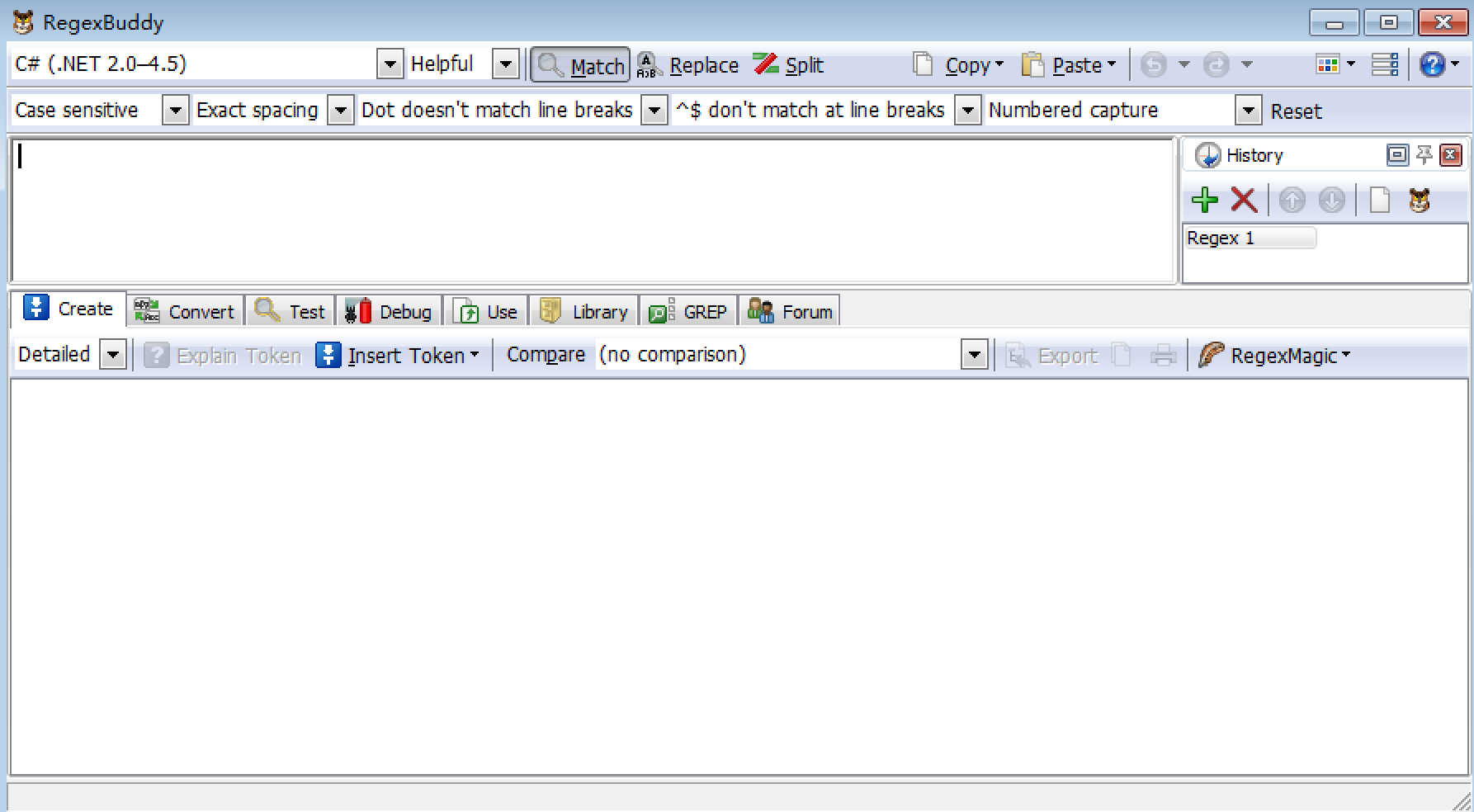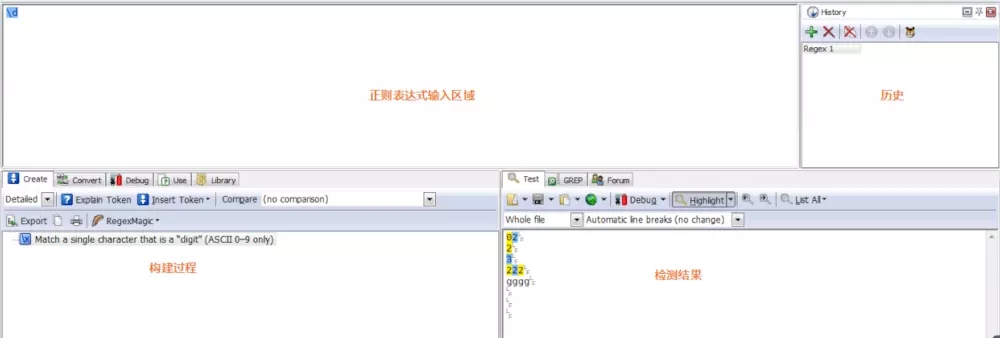 界面主要包括:正則表達(dá)式、測(cè)試文本、輸出結(jié)果、歷史記錄、Create相關(guān)面板,如下圖所示: