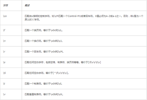 匹配任何空白字符,包括空格、制表符、換頁(yè)符等等。等價(jià)于 [ \f\n\r\t\v]。