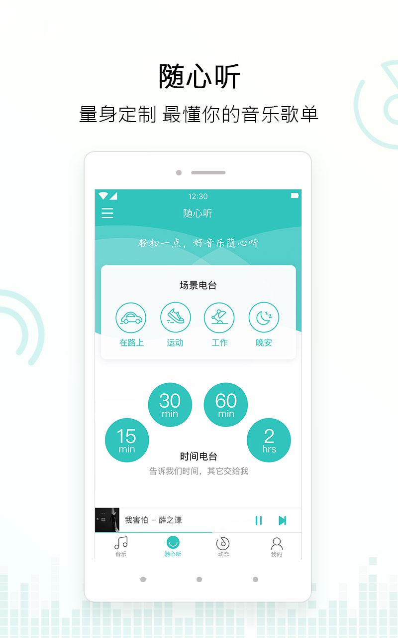 在“隨心聽”界面,可以看到場景電臺和時間電臺,根據(jù)個人需要選擇合適的場景和時間,可以獲得相應(yīng)的歌曲推薦。