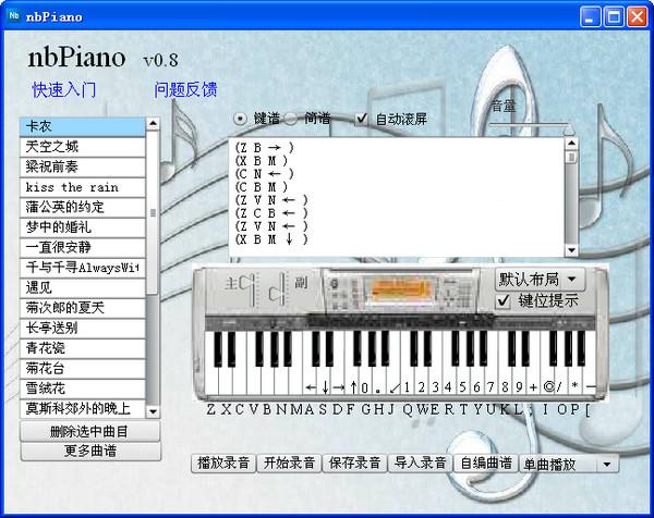 nbpiano模擬電子琴 v0.8 免費(fèi)版 nbpiano模擬電子琴將把你的電腦變成一架高級(jí)電子琴,用戶可以利用它在你的電腦鍵盤上彈奏出美妙的樂(lè)曲nbPiano模擬電子琴擁有很多高檔電子琴才有的功能,如果你有一定的音樂(lè)基礎(chǔ),那么這款軟件會(huì)讓你從中充分感覺到音樂(lè)的樂(lè)趣,讓你充分領(lǐng)略電腦音樂(lè)的美妙。
