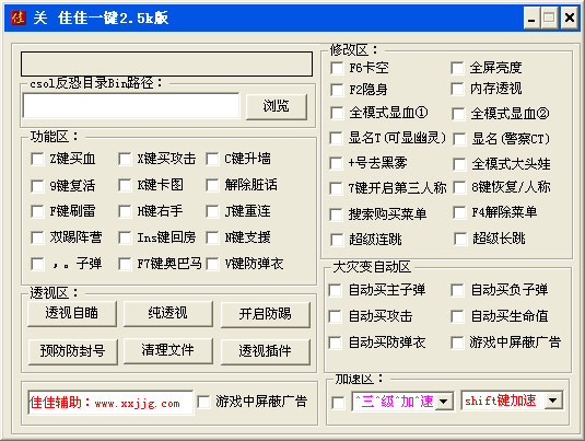 csol佳佳輔助是一款功能強大而又全面的免費csol輔助器。軟件特有的佳佳透視加速功能,讓csol佳佳輔助成為同類輔助工具中最杰出的一款軟件。安全穩(wěn)定,操作方便好用,功能強大全面,絕對免費的CSOL游戲家佳透視輔助外掛。