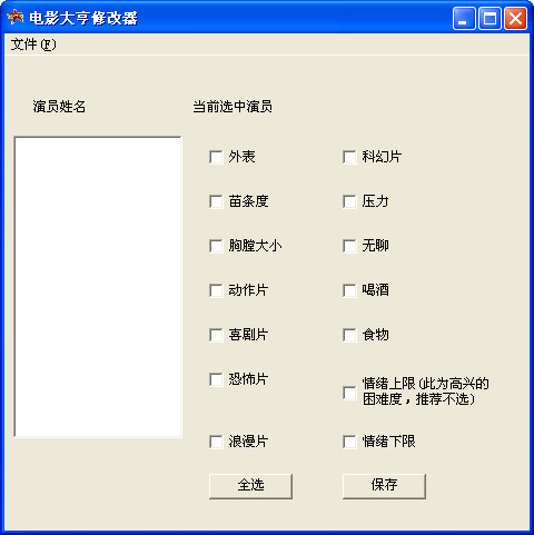 電影大亨修改器又叫電影夢工廠演員屬性修改器,能修改演員屬性幫您輕松完成游戲 使用說明 把“電影大亨修改器.exe”文件拷貝到 “我的文檔/The MoviesStarmaker” 文件夾下,進行修改