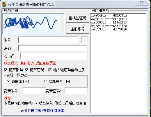 yy賬號注冊機(jī)主要用于無限申請YY小號,支持路由器無限申請,ADSL無限申請。