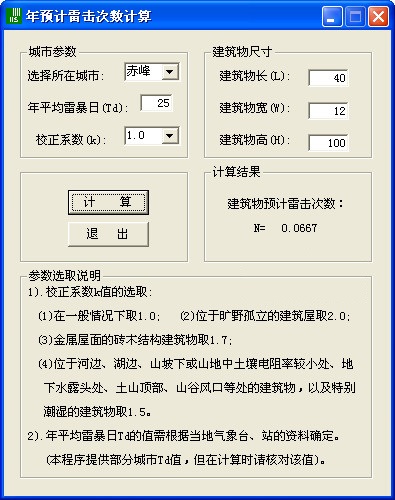 年預(yù)計雷擊次數(shù)計算 v1.0 綠色版 年預(yù)計雷擊次數(shù)計算可以大概的計算出建筑物每年遭雷劈的次數(shù),選擇好城市參數(shù)和輸入建筑物尺寸點擊“計算”即可得到結(jié)果。