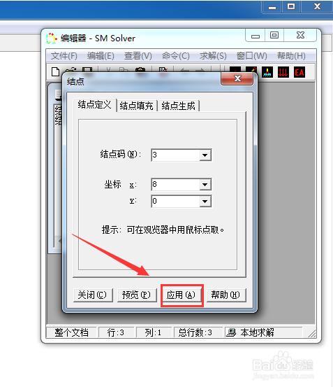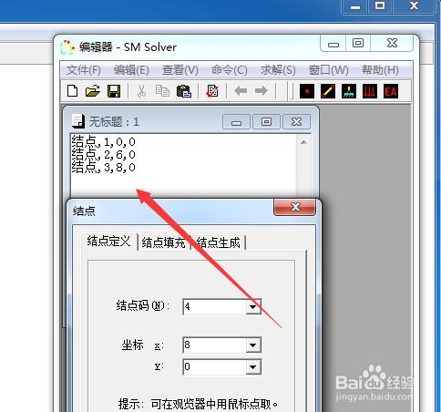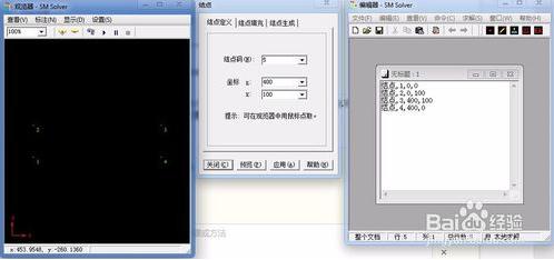 點(diǎn)擊結(jié)點(diǎn)按鈕進(jìn)行結(jié)點(diǎn)輸入。根據(jù)提示進(jìn)行坐標(biāo)輸入,也可以直接在顯示界面用鼠標(biāo)直接拾取位置。我們可以看到在輸入數(shù)據(jù)后在操作界面和顯示界面都有不同形式的顯示。