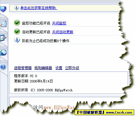 EQSpyWatch (防止間諜流氓軟件)2006 V2.0 綠色版 EQSpyWatch 是具有行為控制的軟件防火墻,在系統(tǒng)底層對(duì)文件,注冊(cè)表,程序運(yùn)行進(jìn)行監(jiān)控.內(nèi)置大量應(yīng)用程序規(guī)則,用于防止間諜軟件,流氓軟件等惡意程序入侵您的計(jì)算機(jī). 您可以自定義監(jiān)控規(guī)則,以便讓軟件更符合您的使用習(xí)慣,同時(shí)開啟自動(dòng)更新功能會(huì)定期更新軟件問題以及應(yīng)用程序規(guī)則.立即下載