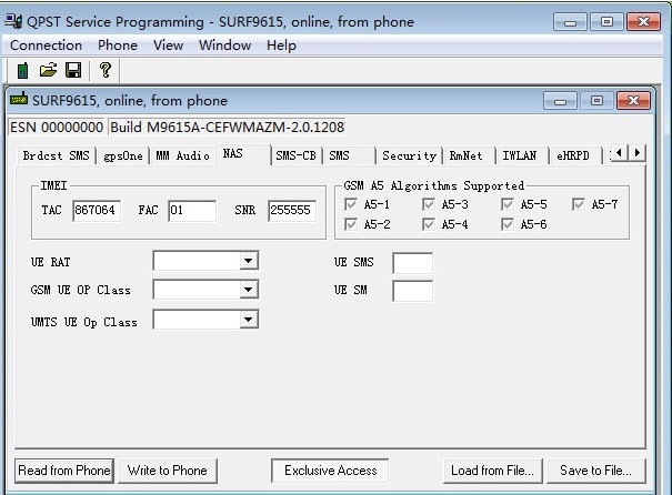 另外還有一個NAS分頁,這個分頁里面顯示的包含手機自身的IMEI,可以對手機的IMEI進行修改(前提是手機NV值為可寫狀態(tài),否則會出現(xiàn)寫入錯誤)。