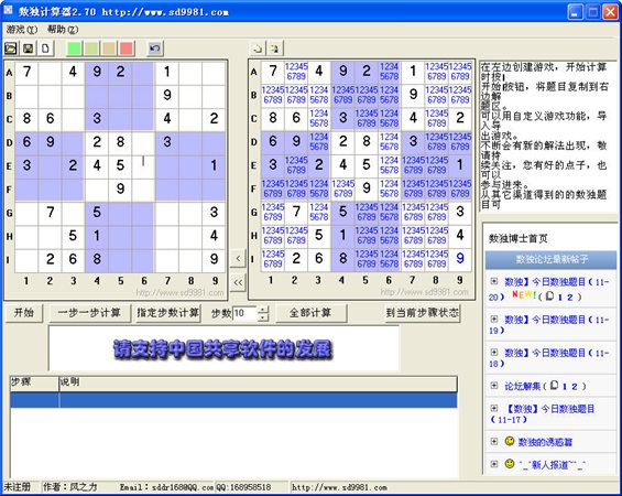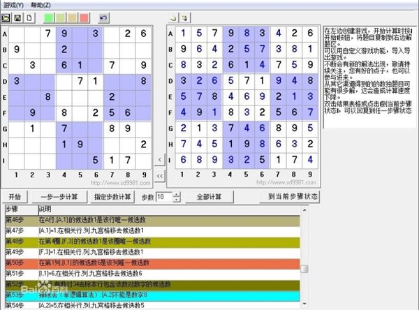 3.目前數(shù)獨(dú)計(jì)算器采用的解題方法為典型的候選數(shù)法解題,新的解題方法會(huì)不斷集成到這里,敬請持續(xù)關(guān)注。您有好的點(diǎn)子,也可以參與進(jìn)來(數(shù)獨(dú)論壇)。