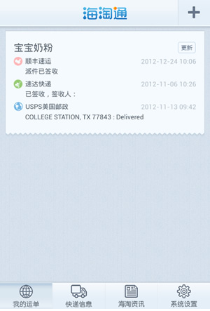 海淘通可以幫你查詢你的運單詳情,支持查詢國內(nèi)外各大主流快遞公司查詢以及大部分的轉(zhuǎn)運查詢。海淘通支持查詢的轉(zhuǎn)運公司、國外快遞、國內(nèi)快遞達(dá)80多家,內(nèi)置主流物流公司查詢跟蹤、最新快遞狀態(tài)自動提醒等便利功能,界面友好,更新迅捷。海淘通便捷的運單查詢管理服務(wù),創(chuàng)新的二維碼同步快遞單號,貼心的物流跟蹤提醒,以及全面的快遞信息列表展示,將成為你海淘的必備利器。