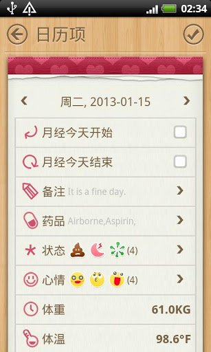 除了基本的經期跟蹤功能與經期日歷,女孩們可以記錄自己的任何癥狀,情緒,性交,重量,溫度,說明或藥丸等等,實際上它可以設計成為您的個人日記和小秘書。