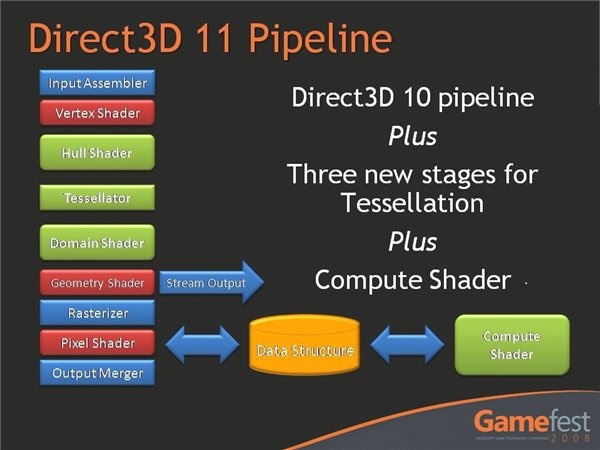 DX11新增了計(jì)算著色器(Compute Shader)代碼示例,在今年的NVISION大會上,微軟就透漏了這點(diǎn),并通過SIGGRAPH以及GameFest 2008大會上放出的幻燈片,我們可以進(jìn)行一些深入的研究。此外,DX11特性的提前放出,對于目前DX10以及DX10.1硬件用戶而言也大有裨益,因?yàn)锳MD和NVIDIA可以照此提前開發(fā)適當(dāng)?shù)尿?qū)動支持。DirectX 11包含了對Direct3D、DirectDraw、DirectPlay、DirectSound、DirectInput等顯示、聲音以及系統(tǒng)的重要升級。新的DirectX 11使你獲得更好的圖像顯示質(zhì)量,使多人游戲具可伸縮性,以及包括更棒的音頻效果。另外,DirectX 11還支持tessellation鑲嵌化技術(shù),這有助于開發(fā)人員創(chuàng)建更為細(xì)膩流暢的模型,實(shí)現(xiàn)高質(zhì)量實(shí)時(shí)渲染和預(yù)渲染場景。多線程是Direct 11的另外一大亮點(diǎn),DX11可以更好地利用多線程資源,從而使游戲更有效地利用多核處理器。