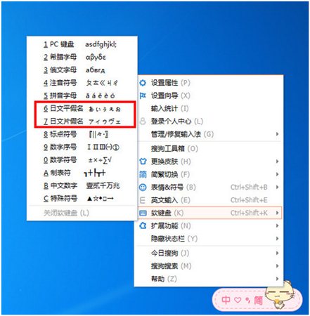 1、右擊搜狗輸入法,點(diǎn)擊軟鍵盤,在軟件盤選項(xiàng)中有“日文平假名”和“日文片假名”