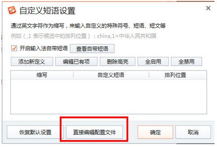 2、在高級(jí)中選擇“自定義短語(yǔ)”==“直接編輯配置文件”