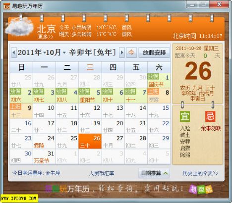 易趣萬年歷下載 v1.4 綠色版 易趣萬年歷是一款多功能免費(fèi)萬年歷軟件。易趣萬年歷綠色小巧,無任何插件。除了可以查詢公歷、農(nóng)歷、節(jié)氣等基本功能外,它還支持天氣預(yù)報(bào)、人民幣匯率、歷史上的今天、法定放假信息以及歷史上的今天查詢。是一款非常全面的日歷軟件。