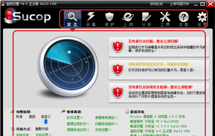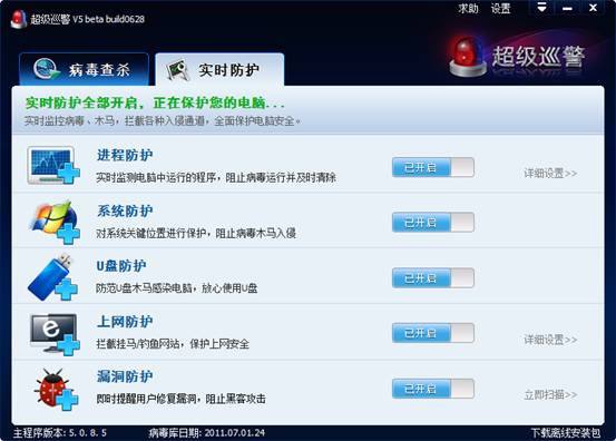 超級巡警是千云旗下的免費(fèi)專業(yè)殺毒軟件,采用雙引擎智能查殺,包括本地反病毒引擎、云端反木馬引擎其中本地反病毒引擎采用多引擎整合技術(shù)包括腳本啟發(fā)引擎、文檔啟發(fā)引擎和高級分析引擎。更快速自動的檢測和清除你系統(tǒng)中各類間諜軟件、蠕蟲、后門、木馬和病毒。為您有效的保護(hù)您的系統(tǒng)安全。