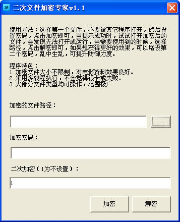 二次文件加密專家是一個(gè)文件加密工具,可以自由選擇加密解密和二次加密,二次文件加密專家,加密文件沒有大小限制,對電影資料效果良好,采用多線程執(zhí)行,不會覺得很卡或失敗,可加密大部分文件類型