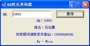 開啟軟件,輸入QQ號碼,點(diǎn)擊查詢按鈕即可,例如輸入10001,查詢結(jié)果顯示QQ姓名為馬化騰。