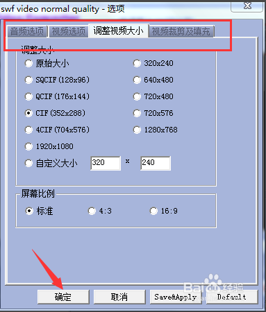 可以根據自身需求設置視頻的音頻,視頻大小等,然后點擊確定;