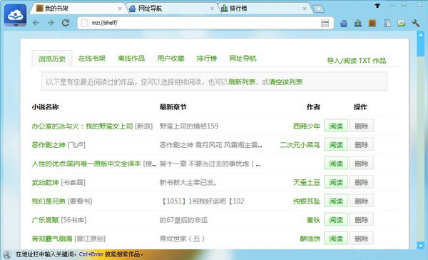 多任務(wù)下載首款多任務(wù)同時(shí)工作的小說(shuō)下載器,允許您接著上次的任務(wù)繼續(xù)下載,完善的小說(shuō)管理界面。