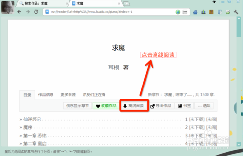 接著就顯示“求魔”小說(shuō)的目錄了。我們直接點(diǎn)擊“離線閱讀”按鈕。