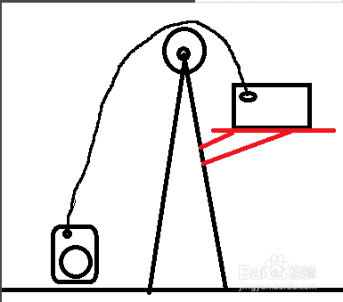 萬事俱備,只欠東風(fēng)了。最后一筆,把兩個(gè)軸心鏈接起來,右邊還是多給一點(diǎn)褶皺,如果一切順利,左邊的籃子會(huì)被拉到上面,如果沒拉上去,有可能是你的三角形籃子沒有畫得足夠尖或者右邊的砝碼畫得不夠大,也就是動(dòng)力不夠。