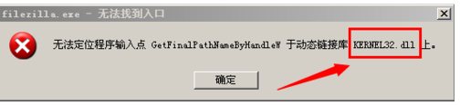錯誤提示,如下圖提示 “無法定位程序輸入點(diǎn)于 動態(tài)鏈接庫KERNEL32.DLL”??吹饺绫纠?KERNEL32.DLL 那一般就是這個dll文件有問題。