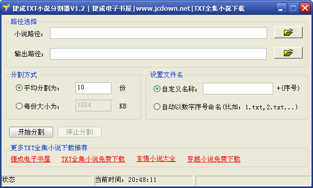 捷成小說(shuō)分割器是一款免費(fèi)的小說(shuō)TXT分割工具,無(wú)需安裝,直接運(yùn)行,分割后的TXT文本文件放入手機(jī)方便閱讀。