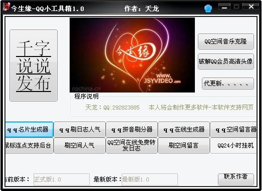 千字說(shuō)說(shuō)發(fā)布、QQ空間音樂(lè)克隆、破解QQ會(huì)員高清頭像、qq名片生成器、qq刷日志人氣、qq拼音刷分器、qq在線生成器、qq空間留言器、鼠標(biāo)連點(diǎn)支持后臺(tái)、刷空間人氣、qq空間在線免費(fèi)轉(zhuǎn)發(fā)日志、刷空間留言、qq24小時(shí)掛機(jī)。
