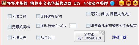 怪怪水族箱修改器是同名游戲的多功能輔助工具,一共八個選項,幫助玩家快速完成游戲。怪怪水族箱是一款2D畫面風格的模擬經(jīng)營類游戲,游戲中,玩家作為一個養(yǎng)魚專業(yè)戶,需要利用養(yǎng)魚來獲得更多的金錢,同時還要保護魚兒不受其他怪物的騷擾,一款很休閑很有愛的小游戲,適合茶余飯后休閑解悶只用