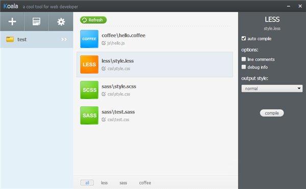 Less 等代碼無法直接在瀏覽器中執(zhí)行,最終還是需要編譯成 CSS 或 JS 。它們語法很棒,但是它們的編譯方式卻不夠靈活。官方基本上都是只提供命令行的方式進行文件編譯, less 還可以在頁面中嵌入一個 less.js 進行在線編譯,但這種方法實在是不靠譜。所以大家都喜歡使用圖形界面工具來進行編譯工作,高效快捷。在 koala 開發(fā)之前已經有一些工具了,比如 winLess 、 simpless 等,功能都比較單一,且只支持 less 。 還有一些同學折騰編輯器 sublime text 等,但目前還沒有一個很完美的方案。還好,現在有了Koala。