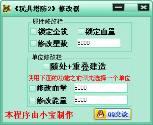 玩具塔防2修改器簡(jiǎn)單的多項(xiàng)功能輔助工具,其界面簡(jiǎn)潔,操作簡(jiǎn)單。功能強(qiáng)大。擁有無限生命,無限金錢,無限星星的修改功能!