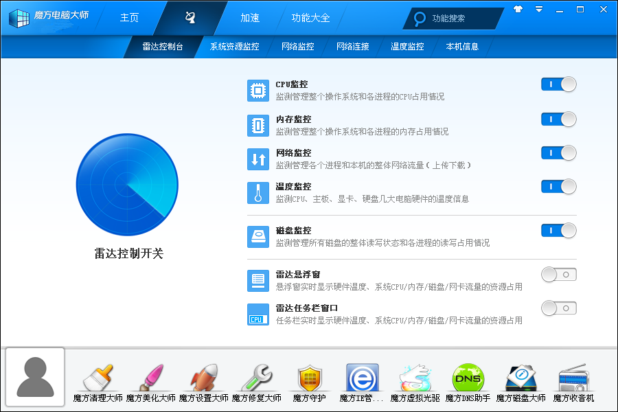 安裝好魔方軟件之后,系統(tǒng)會出現(xiàn)一個魔方桌面,和左下方有一個雷達懸浮框。標注當前計算機的CPU內(nèi)存使用情況等