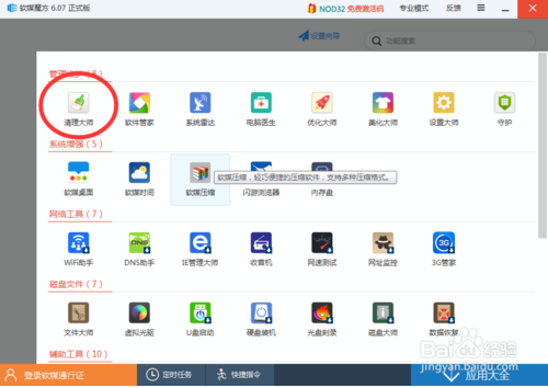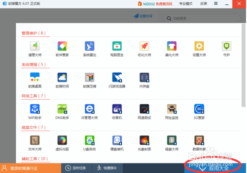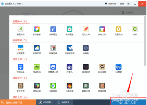 使用過軟媒5或之前的版本的小伙伴肯定會不習慣,因為那些系統(tǒng)工具都不見了。跟之前的菜單完全不一樣,可以找到左下方“應用大全”---點擊進入即可找到啦。