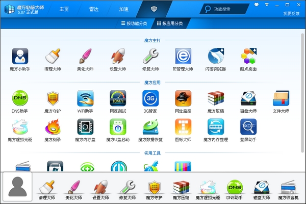 1、安裝好軟件之后,如下圖就是軟媒魔方6的主菜單界面啦。中間區(qū)域按照功能用途進行分類