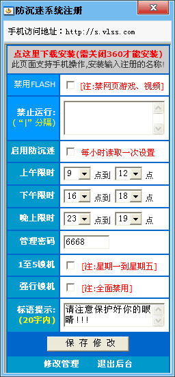 由于家庭電腦的普及,學(xué)生沉迷于電腦已經(jīng)成為所有家長頭疼的問題。任學(xué)生沉迷其中,會影響學(xué)生的學(xué)業(yè),會影響學(xué)生的身體健康,更有甚者會讓學(xué)生沉浸于虛擬的網(wǎng)絡(luò)世界不與人交往,從而影響學(xué)生的人格發(fā)展;完全讓學(xué)生與電腦隔絕,又影響學(xué)生接受現(xiàn)代的信息和先進(jìn)的思想,又有怕學(xué)生成為井底之蛙的顧慮。所以,讓學(xué)生在父母的監(jiān)督下,有節(jié)制地使用電腦成為許多父母的需要,因此開發(fā)防沉迷系統(tǒng)。