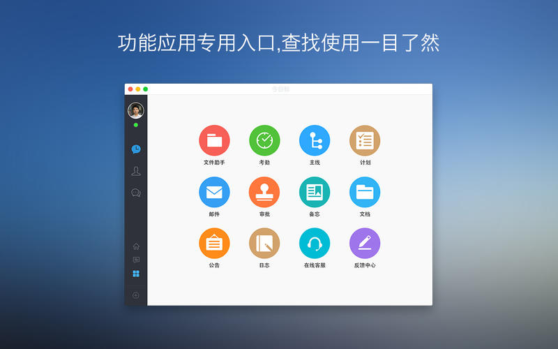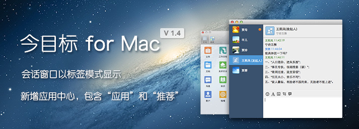 今目標(biāo)mac是這款軟件為mac平臺精心打造的企業(yè)聊天軟件。今目標(biāo)是非常適用企業(yè)的一款即時通訊,它的功能有手機短信、文件傳輸管理、公告發(fā)送、任務(wù)提醒、在線聊天等等,是企業(yè)內(nèi)部構(gòu)建完整平臺不可缺少的軟件。