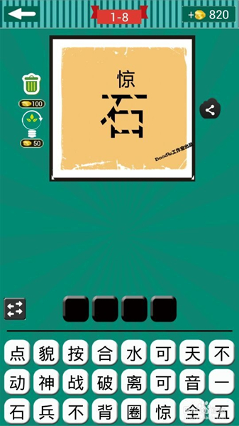 第三種看字體的完整度,有的是文字缺少一部分,或是分散的偏旁,需要組合去猜。圖中的“石”字可以看到像是破了一樣,加上“驚”字在上面,顯然是石破天驚。