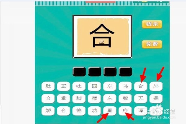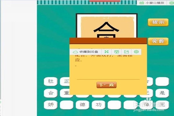 在點(diǎn)擊下一題后,我們會(huì)進(jìn)入下一題。這時(shí)又會(huì)出現(xiàn)一個(gè)方框。在方框中寫有一個(gè)很大的合字,在合字的口里面寫有很小的應(yīng)字,由此我們可以聯(lián)想到成語(yǔ)里應(yīng)外合。我們用鼠標(biāo)的左鍵依次點(diǎn)擊里、應(yīng)、外、合后,這一題就完成了。