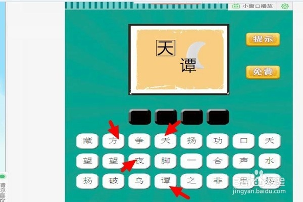 接下來(lái),又會(huì)出現(xiàn)一個(gè)方框。天字寫在一個(gè)正方形的方框中,而譚字的右上方有一個(gè)畫出的月亮。由此,我們可以推測(cè)這個(gè)成語(yǔ)是天方夜譚。在用鼠標(biāo)的左鍵依次點(diǎn)擊天、方、夜、譚后,這一題就完成了。