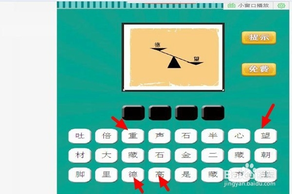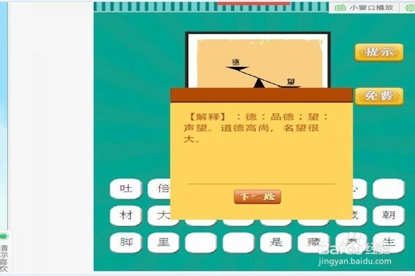 接下來(lái),我們進(jìn)入下一題,在這一題中,會(huì)出現(xiàn)一個(gè)像天平一樣的東西。德字高高在上,而望字卻由于很重把所在的天平稱壓得很低。我們可以理解為德高望重。在用鼠標(biāo)的左鍵依次點(diǎn)擊德、高、望、重后,這一題就結(jié)束了。
