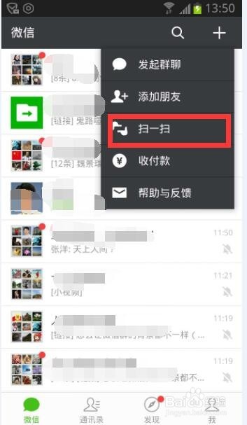 3、然后,打開手機(jī)的微信點(diǎn)擊右上角小人頭。點(diǎn)掃一掃