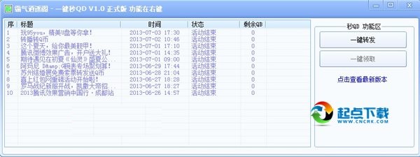 使用方法:1、開啟軟件,登錄QQ帳號,進入軟件主窗口后,會自動刷新最新的轉(zhuǎn)播微博活動,包括活動標(biāo)題、時間、狀態(tài)和剩余QB介紹