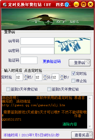 為了幫助q友們得到獎勵,制作了該活動的定時兌換年費紅鉆工具,界面很簡單,登錄之后即可操作,采用易語言編寫,安全無毒,歡迎下載體驗。